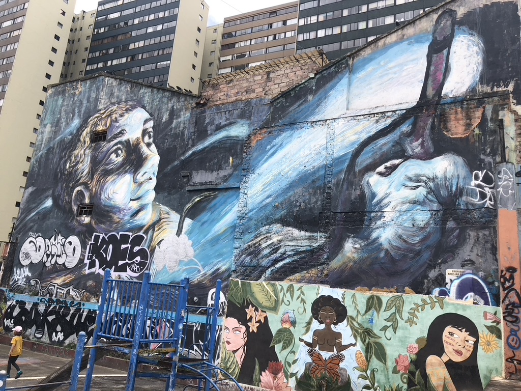 I love the way in which street art democratises creative expression. Sometimes. Not always. But often enough to help create some change. Of course, the evolution of murals in public spaces sits alongside the criminalisation of graffiti and its intersection with racist and classist policing. Sits alongside the politics of representation and transformation in street art movements that say go faster, do better, see me. That challenge the slow turn away from histories of privilege – of racism, sexism, classism and the ongoing impacts of colonisation, dispossession and displacement – in the public art institutions that scatter around the world. Consciously, politically, decolonises the public spaces of empire. Asserts the Indigenous peoples who were here before the Spaniards. Creates new places of belonging from the dispossession of slavery and empire. Here, as you wander the streets in Bogotá, you don’t need to feel like you “belong in a gallery” to lift your eyes and see this meteor of hope being brandished into the sky. To see the dreams in the eyes of the young girl rendered bigger than life on a wall of a building. I’m pretty sure this is Bastardilla’s work. She’s one of the few female street artists in Bogotá. And, in a week when Van Gough and his gallery of sunflowers have made it into the news, here’s the next generation, the everything is always a remix, riffing off Starry Night (perhaps, that’s what I see in the lines). Saying to the girls who pass by – you’re here, see yourself, dream yourself, be bigger than a life that will try to make you small.